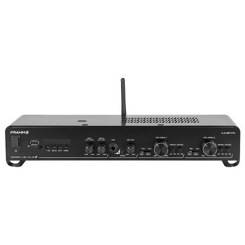 O Frahm Slim IoT 2700 é um amplificador slim ideal para sonorização de ambientes comerciais, corporativos e residenciais, trazendo 160W RMS e dois canais independentes para tocar conteúdos diferentes em dois ambientes (multiroom), com áudio em 2x mono para melhor distribuição em áreas de circulação. Além da operação tradicional, o modelo se destaca pela automação via smartphone e Alexa, permitindo criar cenas/rotinas e controlar o sistema remotamente, com o recurso Volume Inteligente para dar destaque à voz quando o microfone estiver em uso.